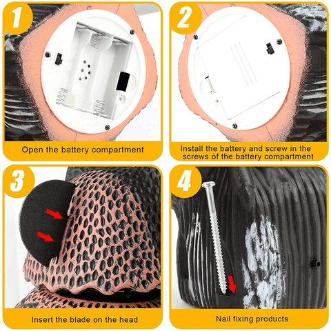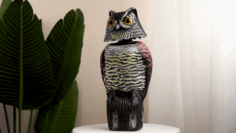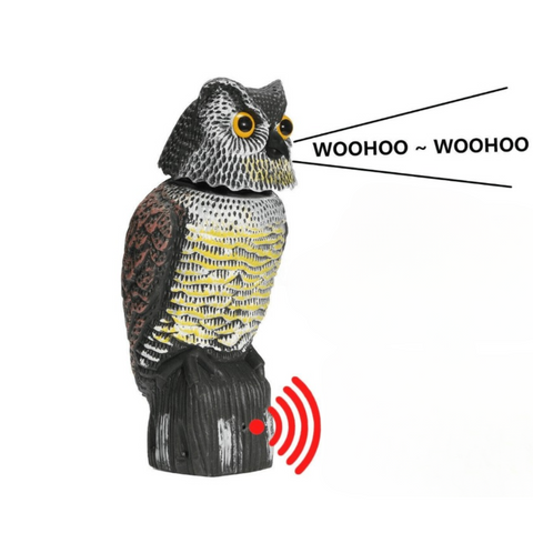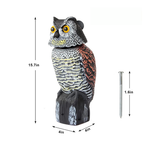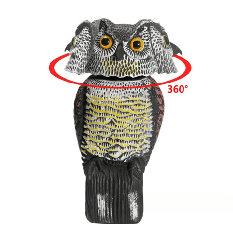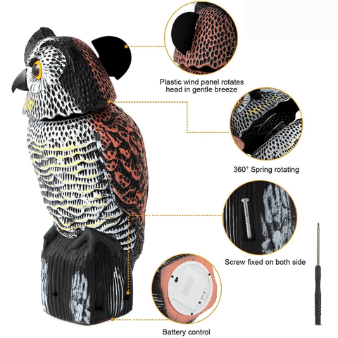 - The owl decoy will now rotate its head and body and emit pre-recorded scary sounds and shadows to deter birds.