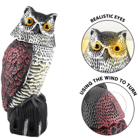 Rotating Head: The product features a rotating head 360° that looks like an owl, which is designed to scare away birds and rodents.