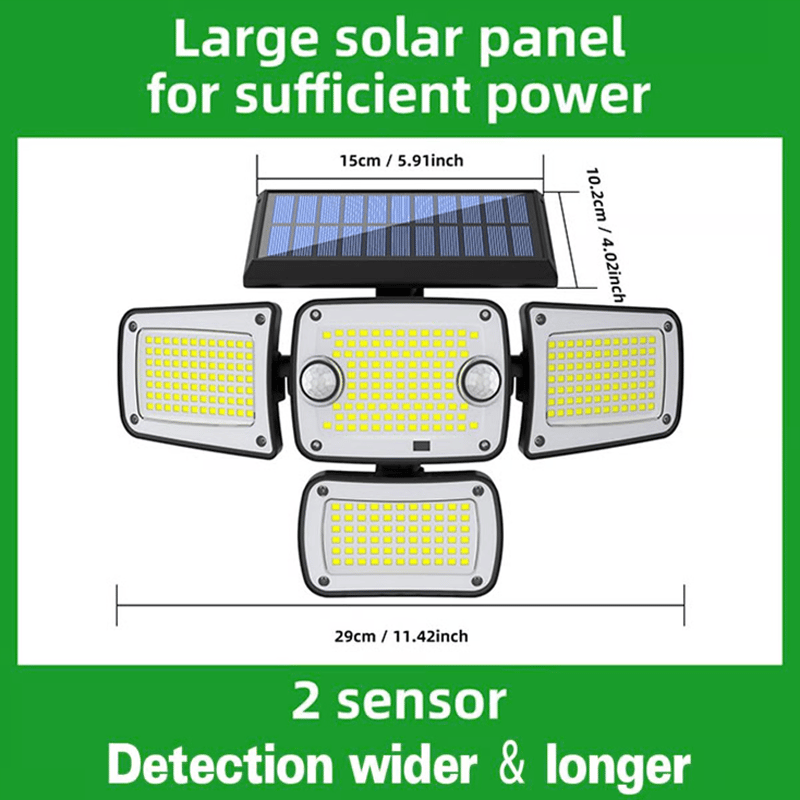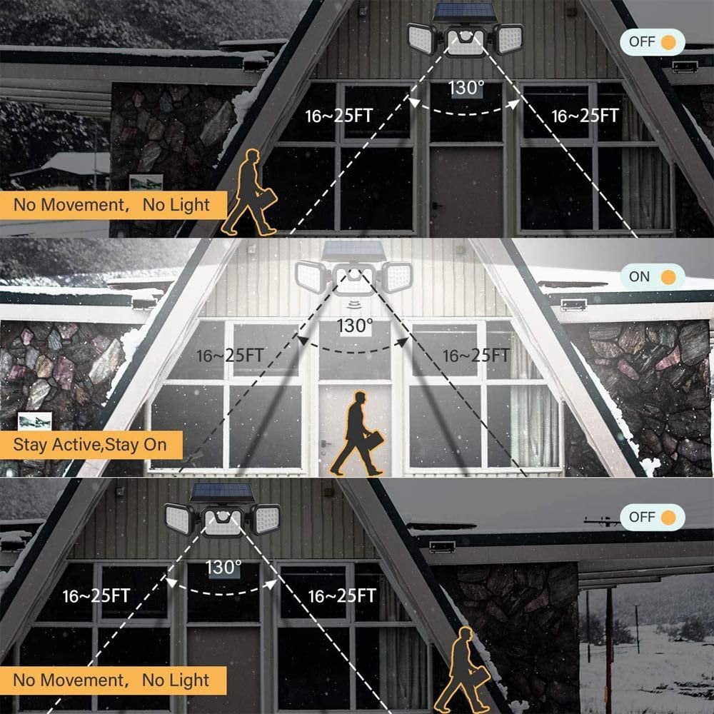 With the innovative wide-angle and 3-headed design. adjustable heads can move upwards. downwards. and horizontally. Up to 270° wide lighting angle. easy to adjust the light heads. lens hoods. and motion sensor to different angles as your requirement. which can provide extra brightness and more visible area.